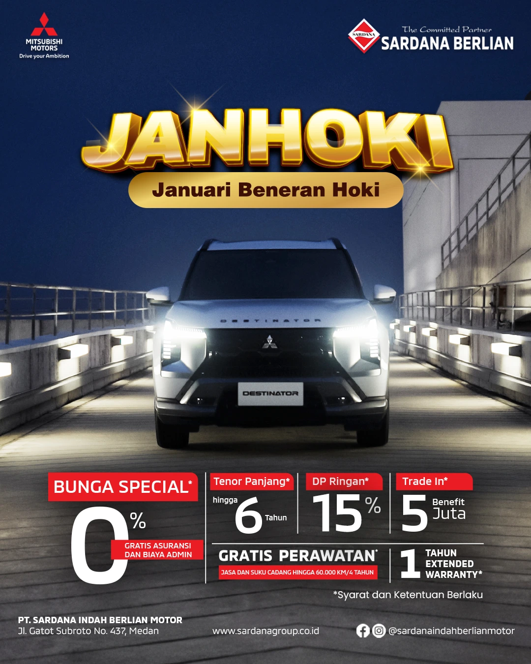 Spesial di bulan Januari 2026 ini, Dealer Sardana IndahBerlian Motor hadir dengan promo spesial. Promo bertajuk bertajuk 'JANHOKI' (JANUARI BENERAN HOKI) siap memberikan diskon spesial untuk pembelian mobil di bulan ini, khususnya Mitsubishi Destinator.